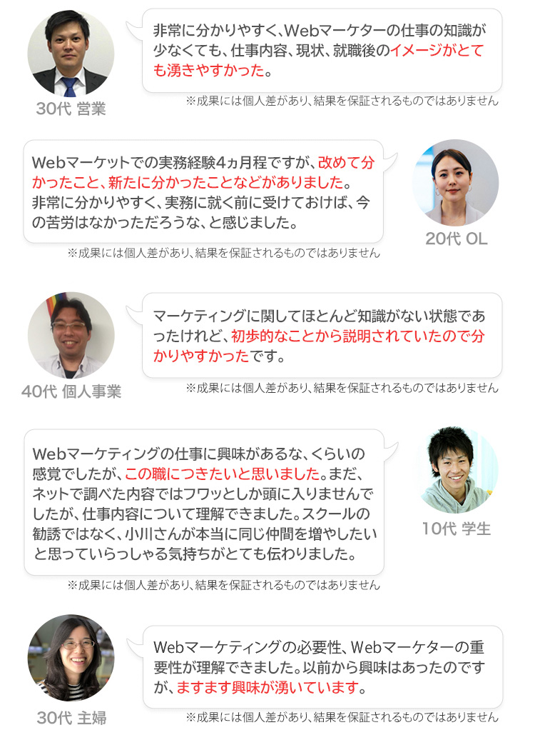 これから、自分の仕事のためにWebマーケティングの知識を活用したい、仕事をしたい方に是非、おすすめします。 また、私のような年齢の者でもできました。若い方であれば、できないはずはないと思います。 今、ここで迷わずチャレンジしてみませんか。わからないことはどんなことでも講師に聞いてください。 そうすれば大丈夫かと思います。