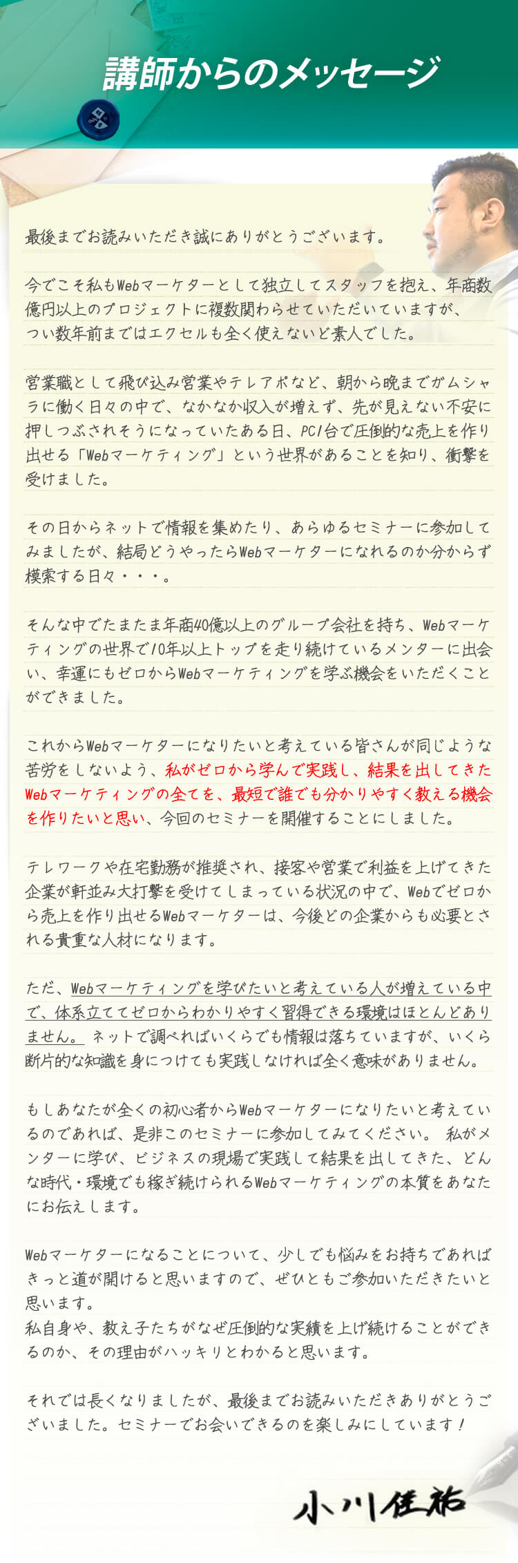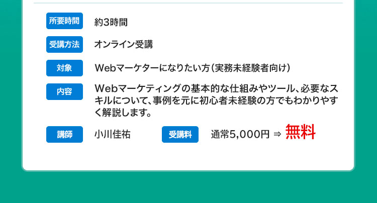 あなたが今どんな仕事をしていたとしても、Webマーケティングのスキルがあることは安心感ももたらします。 会社での急なネット事業化や、長期のリモートワークへの対応など、時代の流れに沿って活躍できるチャンスを見いだせることでしょう。 先行き不透明な今の時代だからこそ、Webマーケティングのスキルを手に入れていただきたいと思っています。