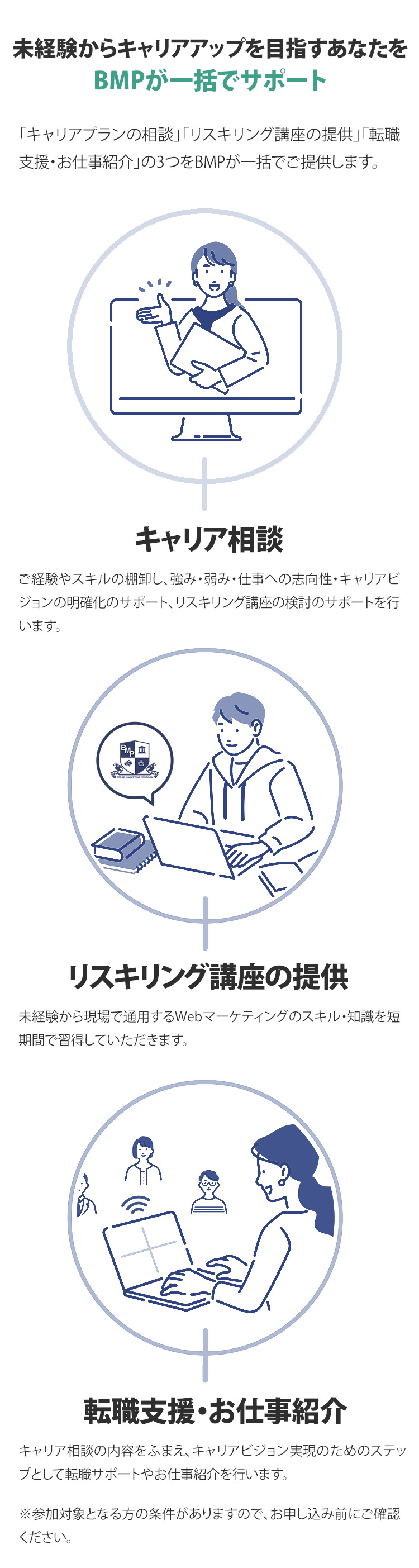 カリキュラム修了後には、BMP専属のキャリアコンサルタントのアドバイスのもと、受講生ひとりひとりのニーズに合わせたキャリアサポートを行っています。